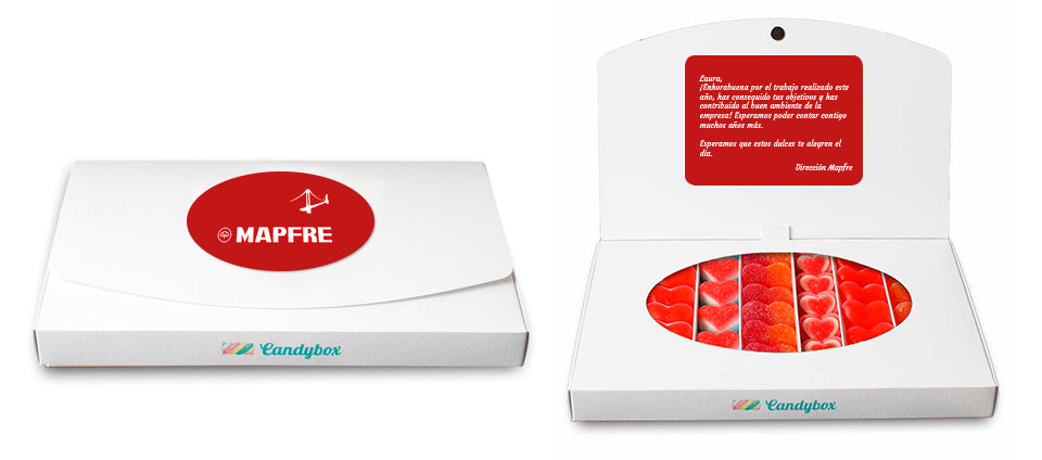 Puedes incorporar el logo de tu empresa en la portada de la caja, creando una Candybox totalmente alineada con tu identidad corporativa. Además, también tienes la opción de añadir un mensaje personalizado en el interior, impreso en la parte interna de la tapa, para que el impacto sea inmediato al abrirla.