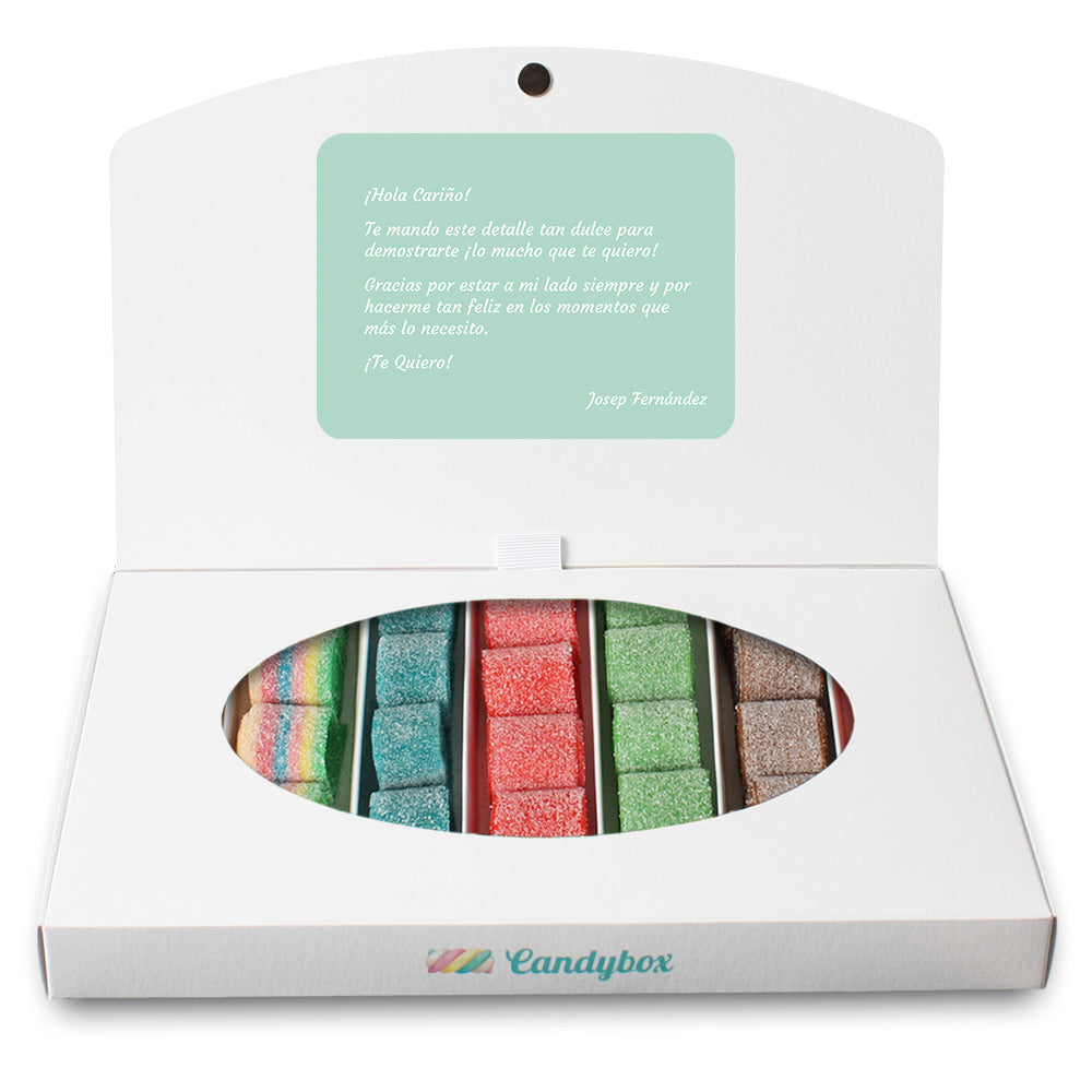 ¿Quieres decirle a esa persona especial lo importante que es para ti? Con esta caja surtida de sabrosas lenguas de colores lo podrás hacer de un modo divertido y personalizado. Está especialmente indicada para personas que destaquen por su dulzura. Puedes redactar un mensaje breve que la persona leerá cuando levante la solapa ¡Le encantará el detalle!