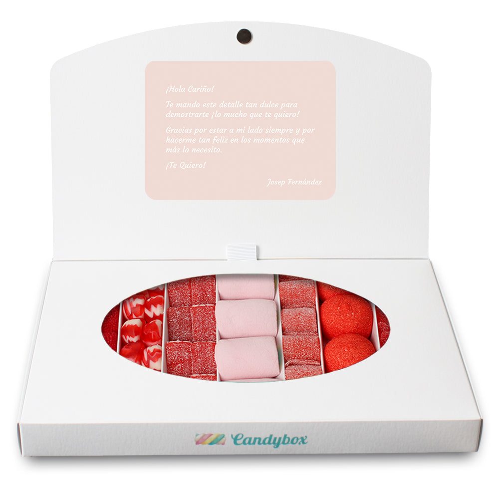 ¡La vida es mejor con chuches! Por eso, esta caja surtida de gominolas rojas y rosas, de sabor a fresa, será el regalo ideal para esa persona tan especial. Puedes redactar una dedicatoria que incluiremos dentro de la candybox. Con este detalle ¡acertarás o acertarás!