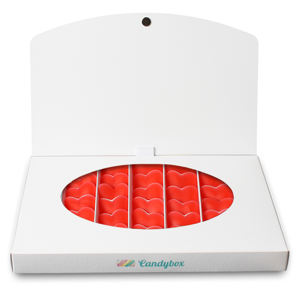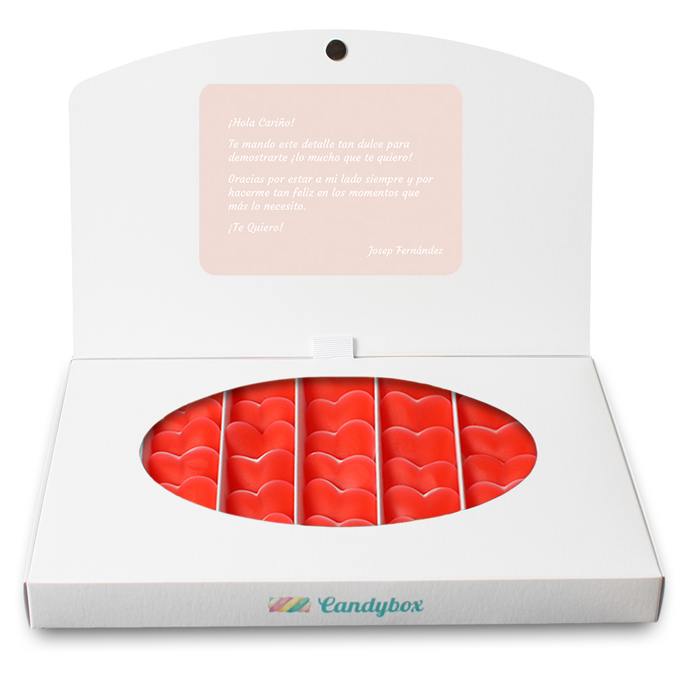 Els cors vermells simbolitzen l'amor més apassionat. Si estàs vivint una història d'amor de pel·lícula o ja fa anys que tens al teu costat a la persona més especial de la teva vida, aquesta caixa de llaminadures serà el detall perfecte. A més pots redactar un missatge que la persona llegirà quan destapi la solapa de la caixa. Amb aquest regal personalitzat faràs que aquesta persona s'enamori més de tu. Garantit!