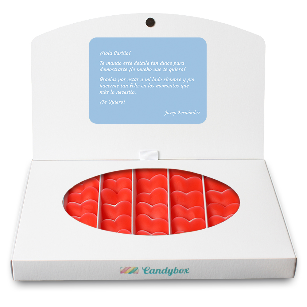 Vols demanar els petons més dolços d'una manera especial o expressar-li a aquesta persona que et té boig o boja tot el teu amor? Doncs aquesta caixa assortida de cors vermells serà el detall perfecte. Enviarem la Candybox on tu ens diguis: a l'oficina, a casa ... Pots redactar una dedicatòria breu que inclourem dins de la caixa perquè el regal sigui personalitzat 100%. T'imagines el seu somriure en rebre el regal? S’emocionarà!