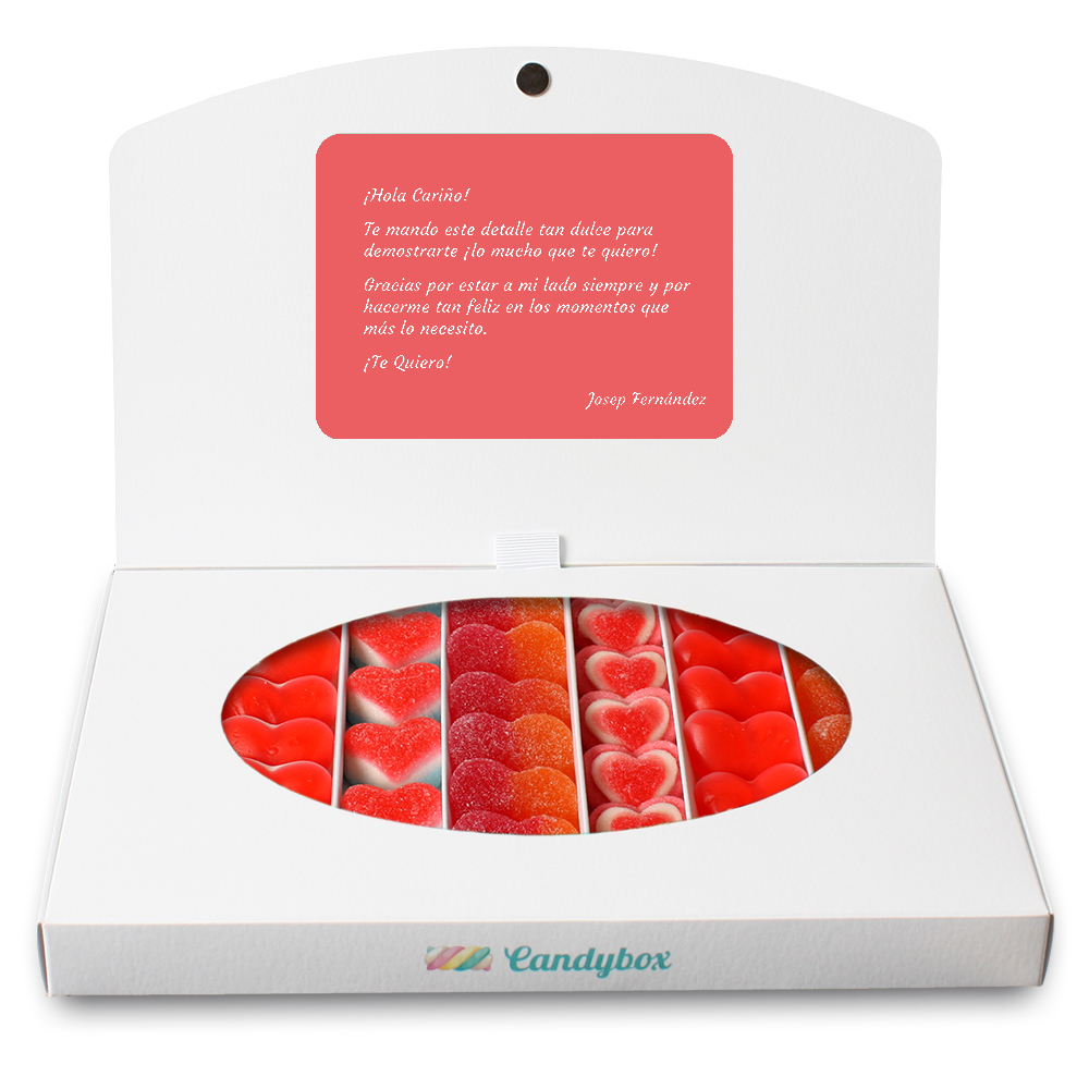El millor regal per Sant Valentí és aquesta caixa assortida dels cors més sweet. La seva etiqueta amb frase d'amor i disseny exclusiu conquistarà a aquesta persona especial, per la qual sospires. Si vols pots completar i personalitzar el detall romàntic amb una dedicatòria que la persona veurà quan aixequi la solapa. Et proposem que li enviïs la Candybox a l'oficina el Dia de Sant Valentí. Imagines seva carona?
