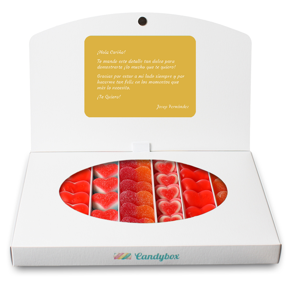 Vols fer el millor regal aquest Sant Valentí? Et proposem aquesta caixa assortida de llaminadures en forma de cor amb frase d'amor. T'agrada? Doncs si et ve de gust pots personalitzar el detall amb una dedicatòria que aquesta persona tan especial llegirà quan aixequi la solapa de la caixa. Serà genial si li envies la Candybox a la feina o a casa... Després podreu compartir junts les llaminadures el Dia dels Enamorats mentre veieu una peli al sofà. Et sembla bona idea?