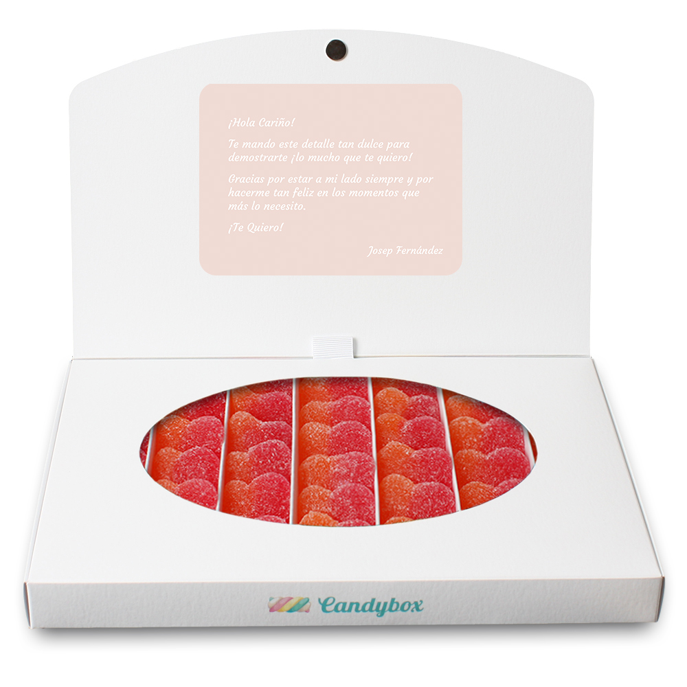 Si tens al teu costat a la persona més genial del món, la que et fa veure la vida de color de rosa, és el moment de demostrar-li el teu afecte amb aquest detall dolç. Es tracta d'una caixa de disseny exclusiu, amb frase inspiradora, assortida de cors ensucrats. Pots fer que el detall sigui personalitzat 100% redactant un text breu que la persona llegirà quan aixequi la solapa. T'imagines la sorpresa que s’endurà si li envies el regal a l'oficina? Segur que li encanta!