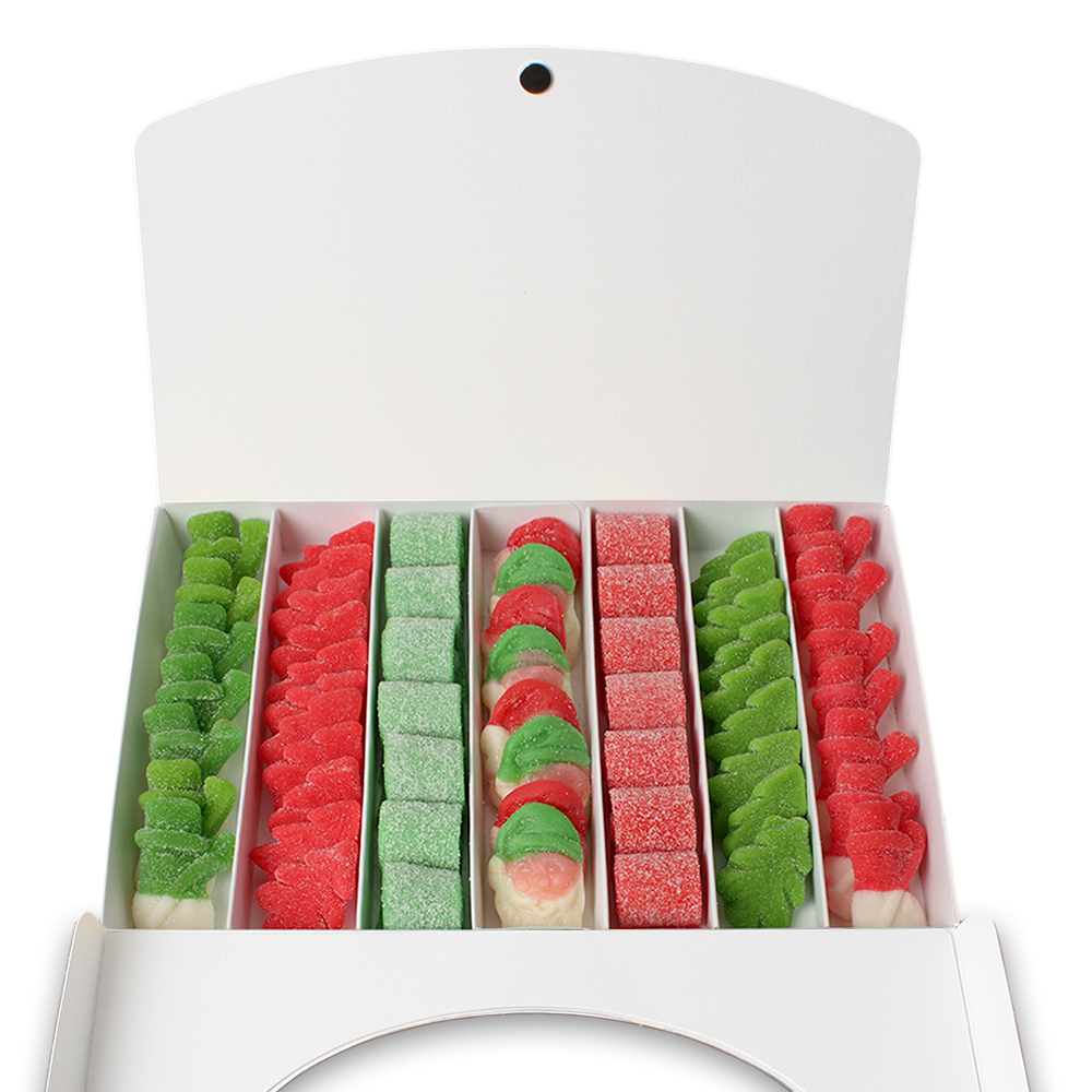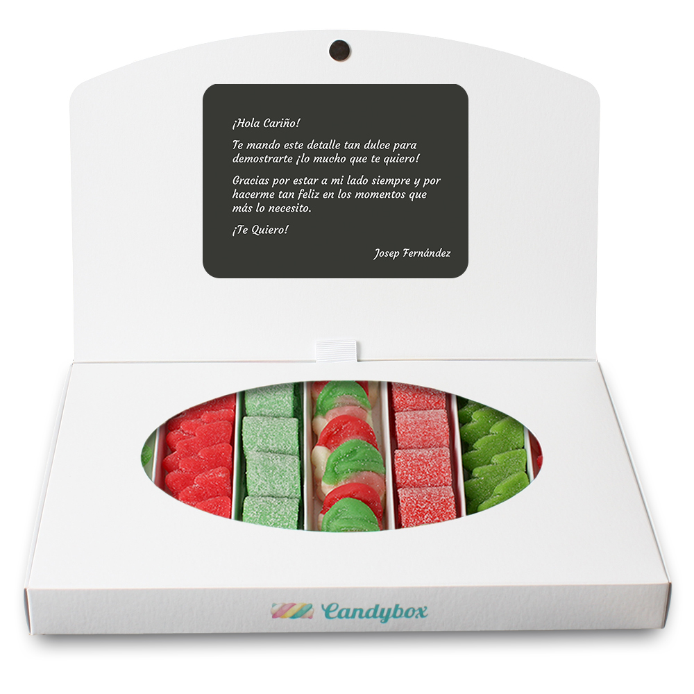 "El 25 de desembre, fum, fum, fum, ha nascut un minyonet, ros i blanquet..." El Nadal amb aquesta caixa de llaminadures Candybox, amb colors tant nadalencs com aquests, ara serà més dolça que mai. Demostrali a la teva mare, al teu pare, al teu germà o germana, al teu amic preferit, a la teva parella, a aquell company de feina tan divertit... Resumint, a qui tu vulguis. Felicita-li les festes desitjant-li "Bon Nadal, bon rotllo i felicitat".