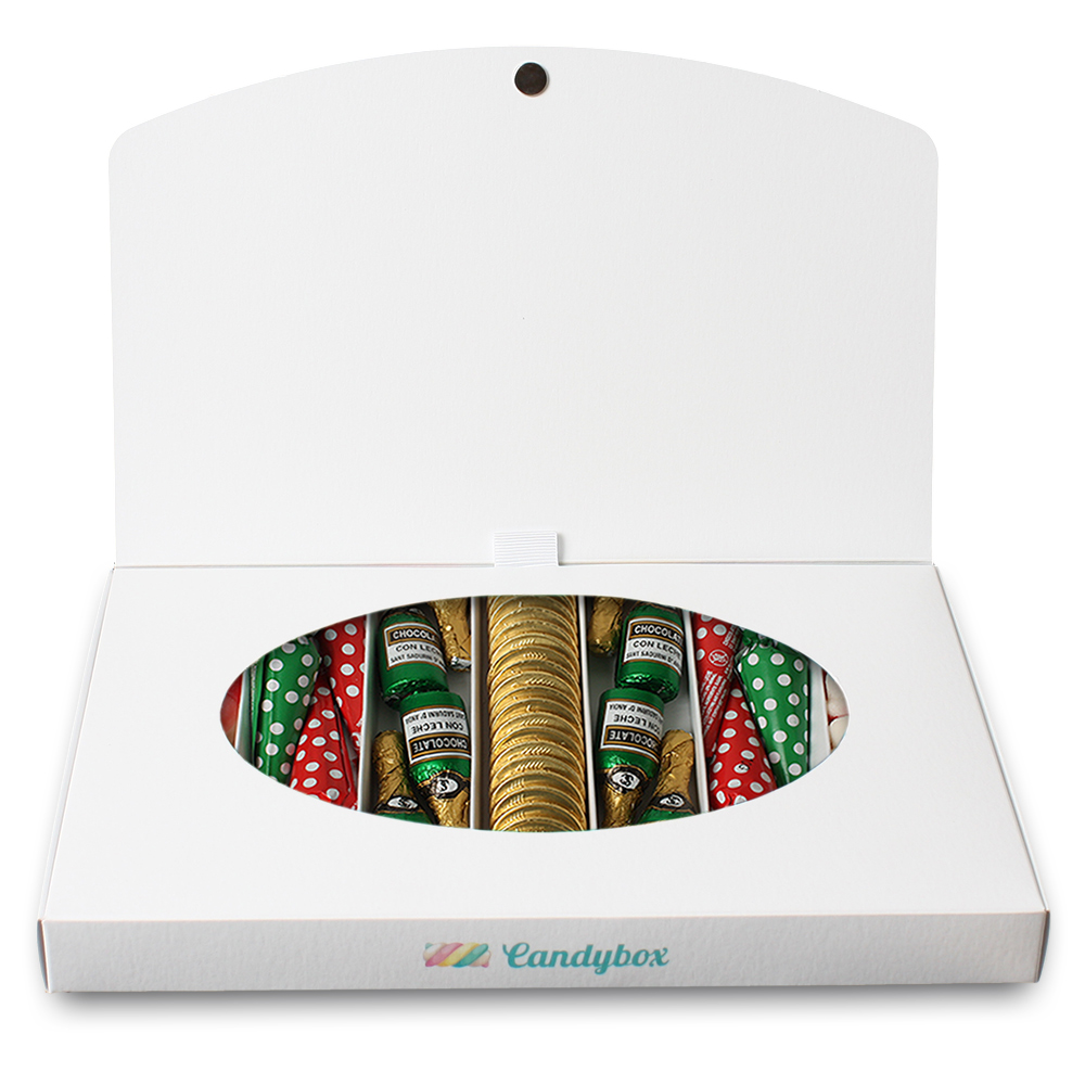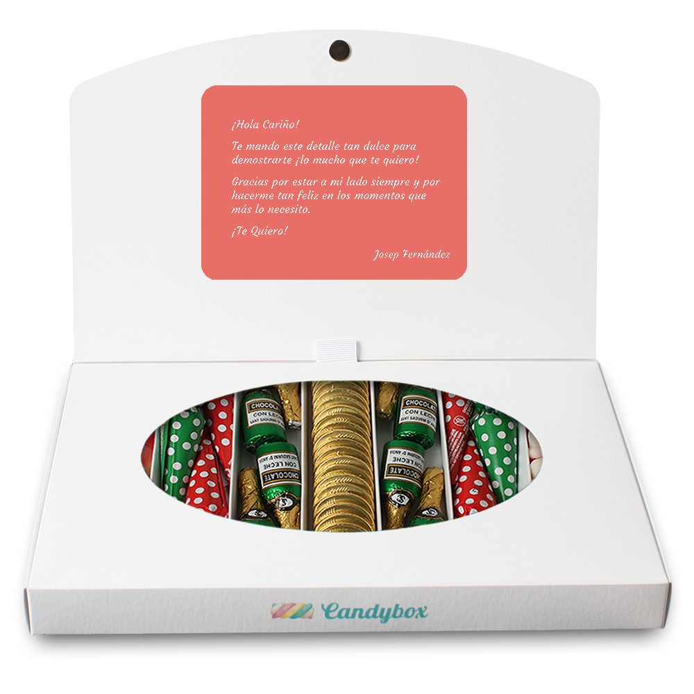 Estàs buscant un regal de Nadal molt dolç per aquesta persona que tant estimes? Llavors, sens dubte, aquest és el seu. Ve carregat d'artilleria pesada: monedes d'or, paraigües molones, ampolles de xampany francès, alguns Pare Noel probablement vinguts des de Lapònia, i divertits ninots de neu. Això sí, tot creat amb una suculents xocolata amb llet i en forma de gominola. Però si tot això no és suficient, i vols que la caixa respiri més esperit nadalenc, pots personalitzar-la amb un missatge propi al seu interior.