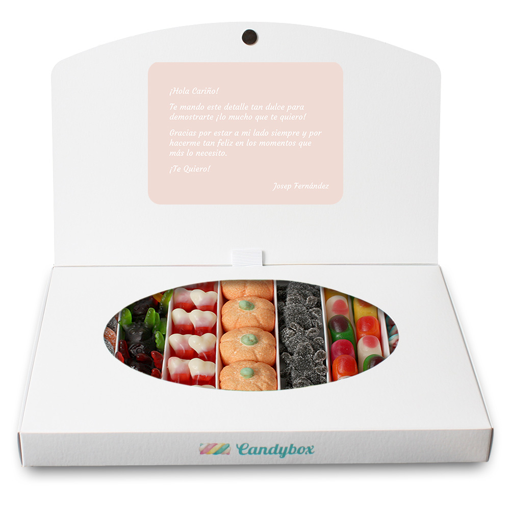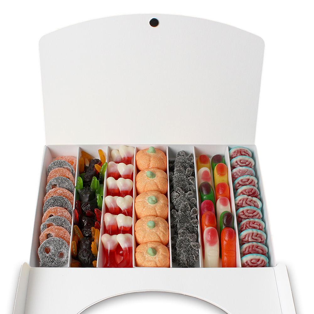 Esta sabrosa Candybox contiene las chuches más espeluznantes, en forma de calabaza, calavera, dedo, cerebro… Será el detalle ideal para alegrar el día de Halloween a esa persona especial, que tanto disfruta con las golosinas. Puedes incluir un mensaje personalizado que la persona leerá cuando destape la solapa de la caja ¡Acertarás sí o sí!